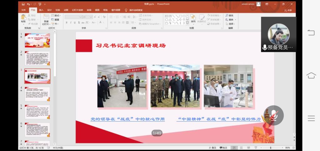 讨论课上,员工党员和积极分子围绕“在战疫中坚定党的领导,彰显中国精神”这一主题,结合实际,分享了自己对疫情期间我们国家所做努力的看法和疫情之后自己的感悟。通过学习,同学们认识到坚持党的领导是我们战胜疫情的根本保证。正是因为我们党时刻牢记人民利益高于一切,坚持一切为了人民,我们才可以战胜疫情。